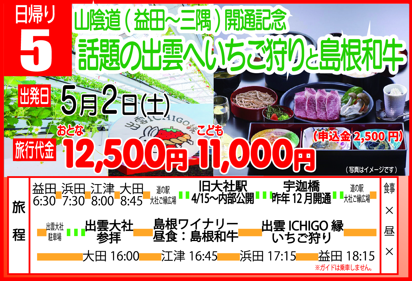 山陰道(益田~三隅)開通記念 話題の出雲へいちご狩りと島根和牛 (日帰り 5)
