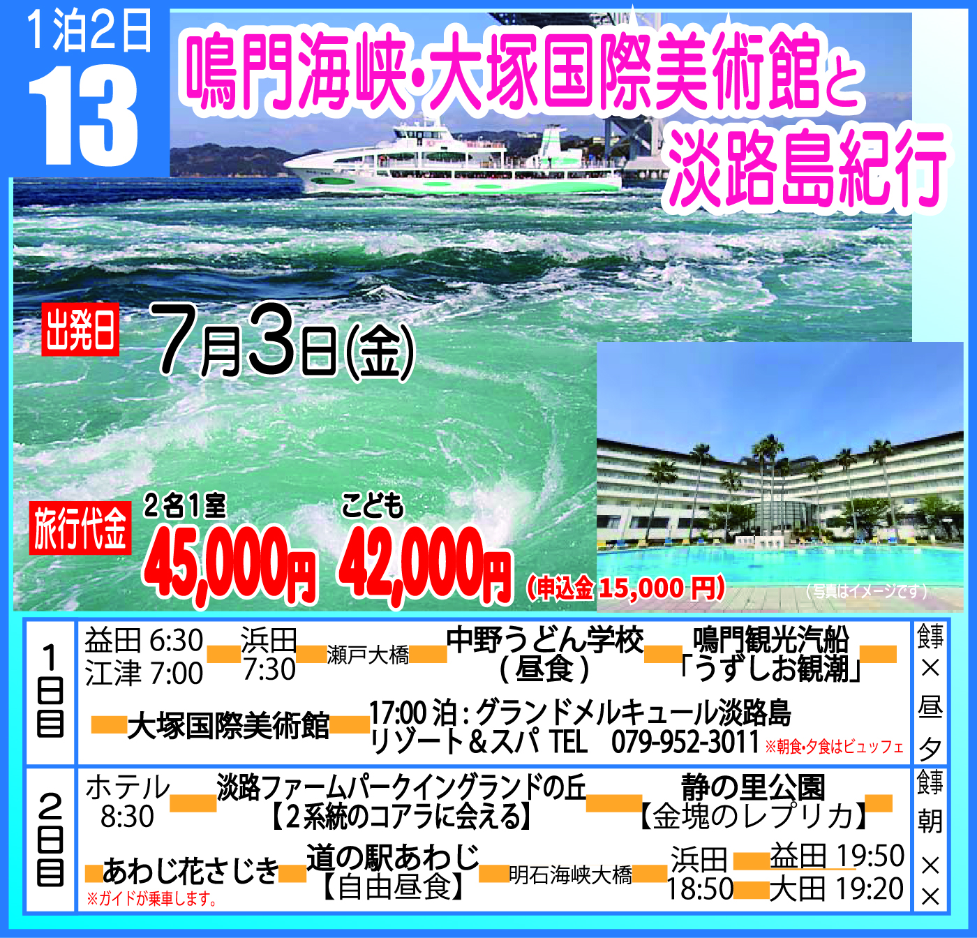 ◆旅行代金には、交通費・宿泊料・食事代・入園料等、チラシに明示し たものの他、諸税が含まれております。(申込金は旅行代金に充当いたします。)